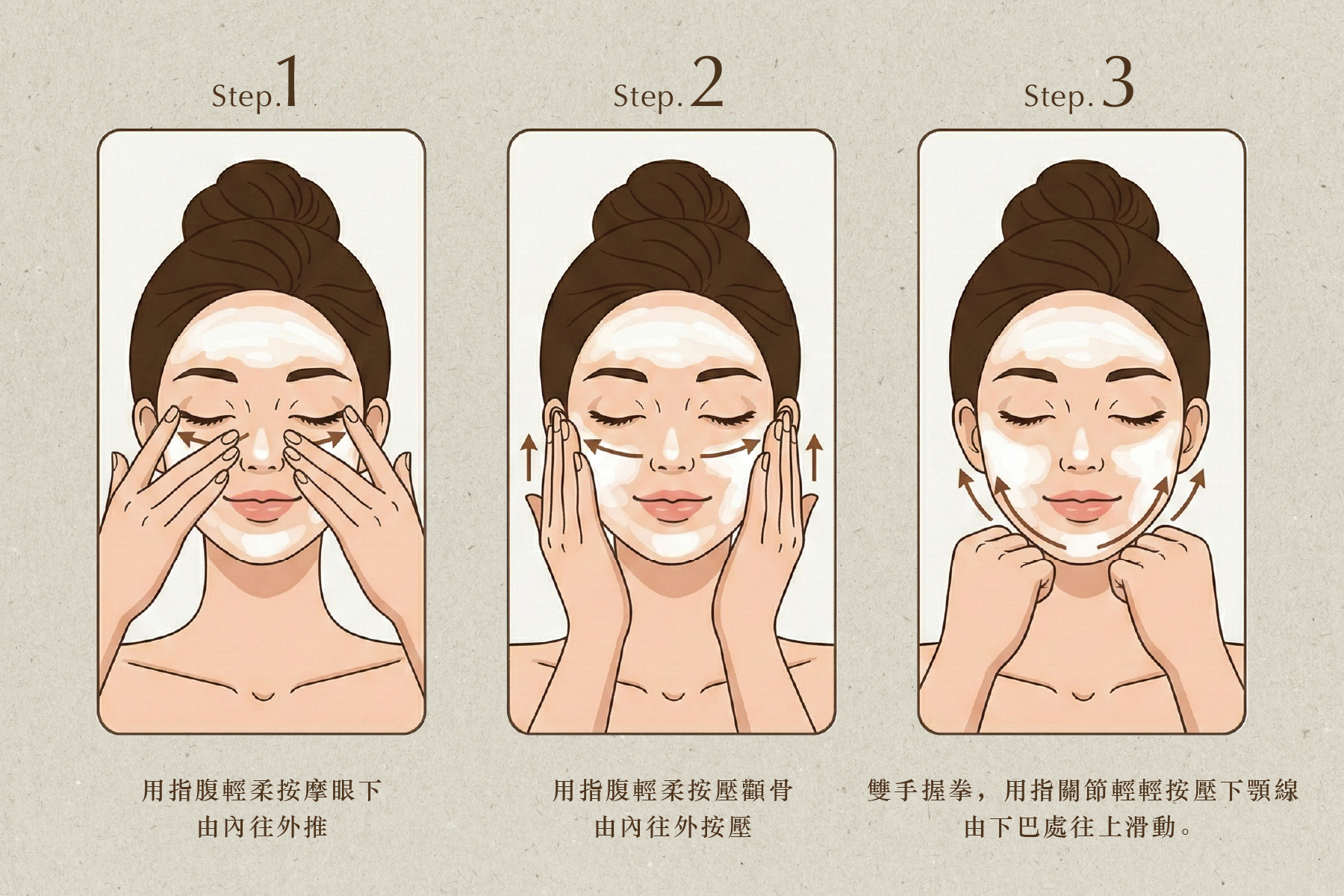 早上使用保濕乳液或精華,用指腹輕柔按摩眼下、顴骨下方與下顎線,