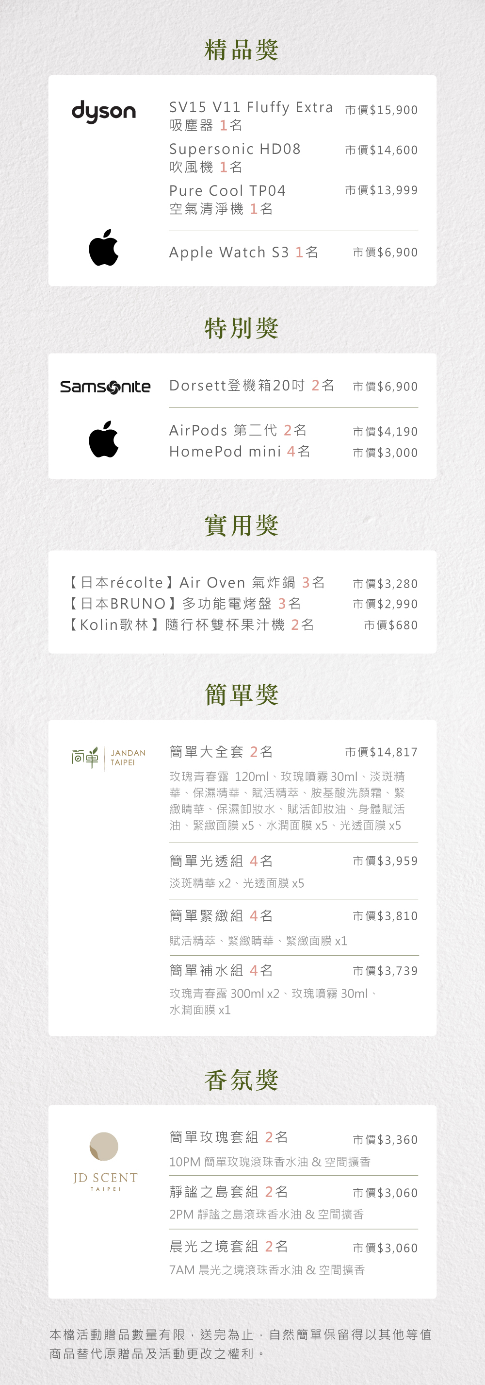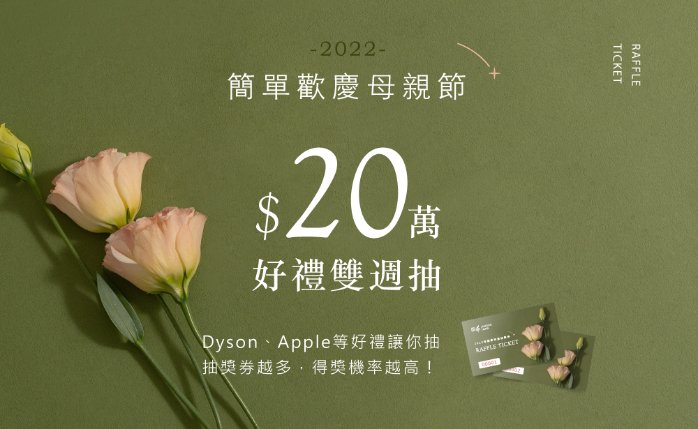 未抽中者可再參加後續抽獎活動,越早買+抽獎券越多=得獎機率越高!!!實際抽獎時間將依簡單粉絲專頁為主。