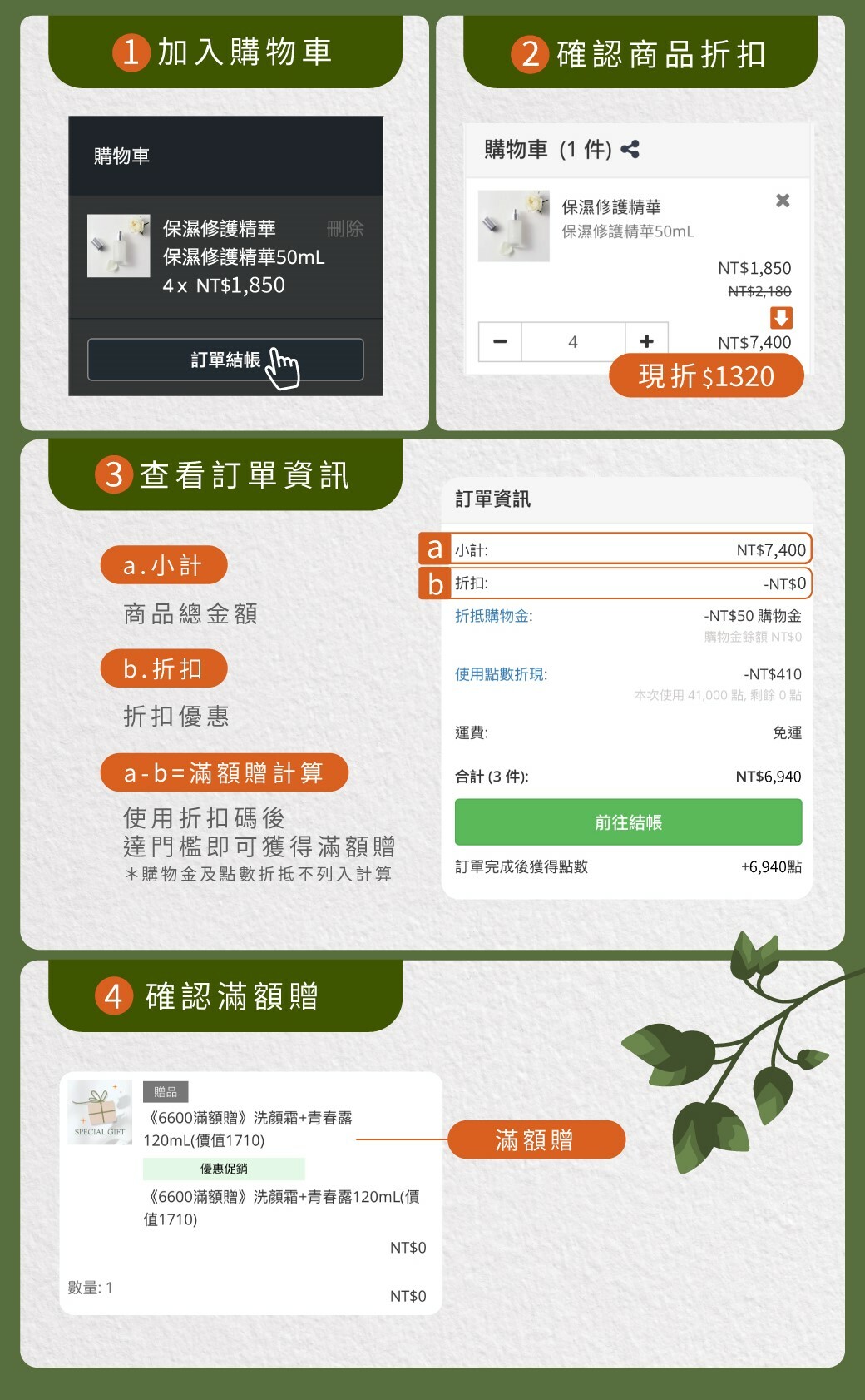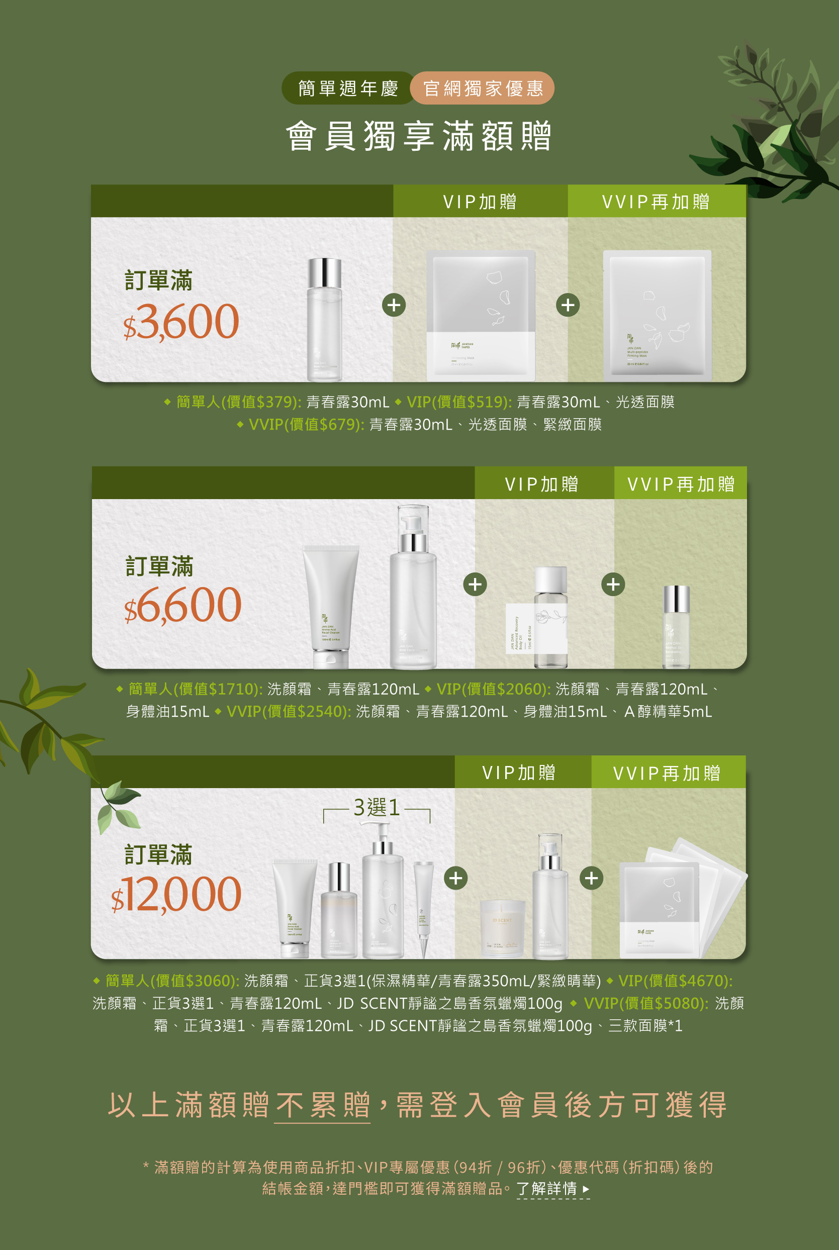 🔍情境舉例:VIP買2組《週年慶限定》賦活精萃50mL(加大版)+A醇抗痕精華20mL,金額是$4,050x2=$8,100,使用VIP專屬折扣96折後結帳金額為$7,776,達到滿額$6,600門檻,將領以下滿額禮: