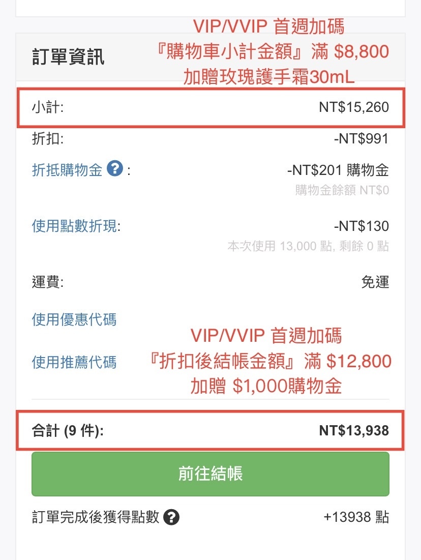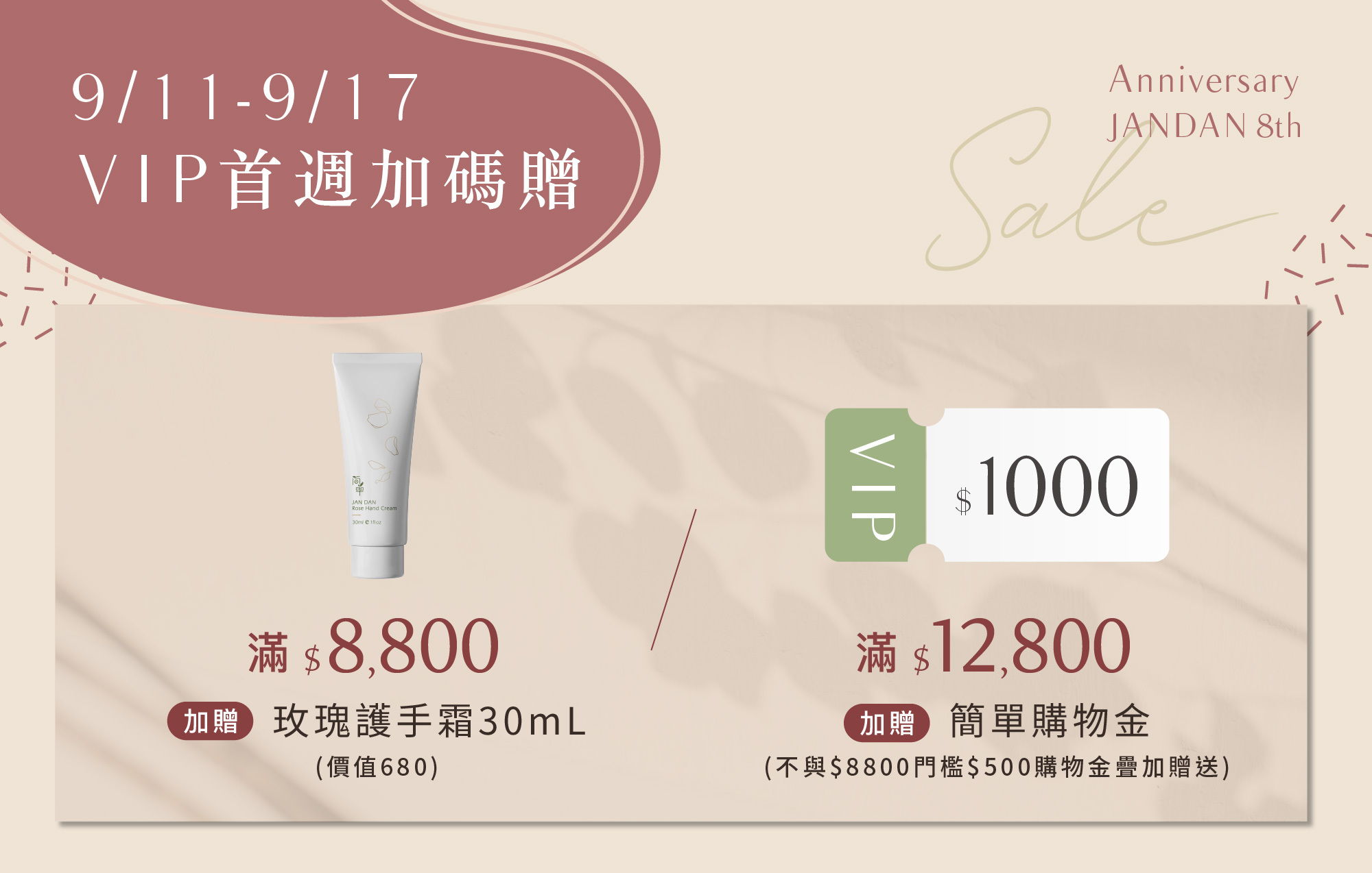 9/11(三)中午12:00 - 9/17(二)晚上23:59,會員等級VVIP、VIP除了既有的週年慶滿額贈品外,消費滿8800將加贈玫瑰護手霜30ml(價值$680);消費滿12800將加贈1000購物金(不與500購物金疊加贈送)
