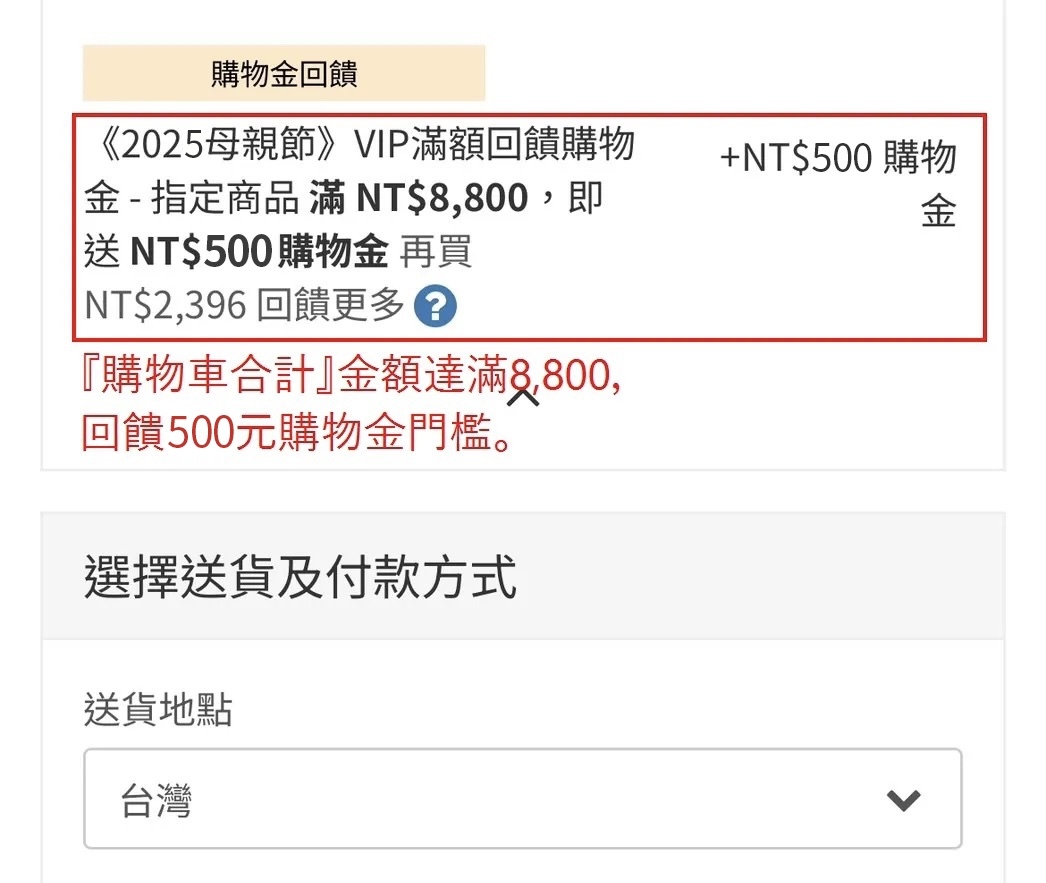 *限時加碼購物金門檻,以『購物車合計』(含VIP會員折扣)做計算,購物金將於取貨後7-10日,「訂單狀態已完成」後自動撥入帳戶,有效期限2025/8/31