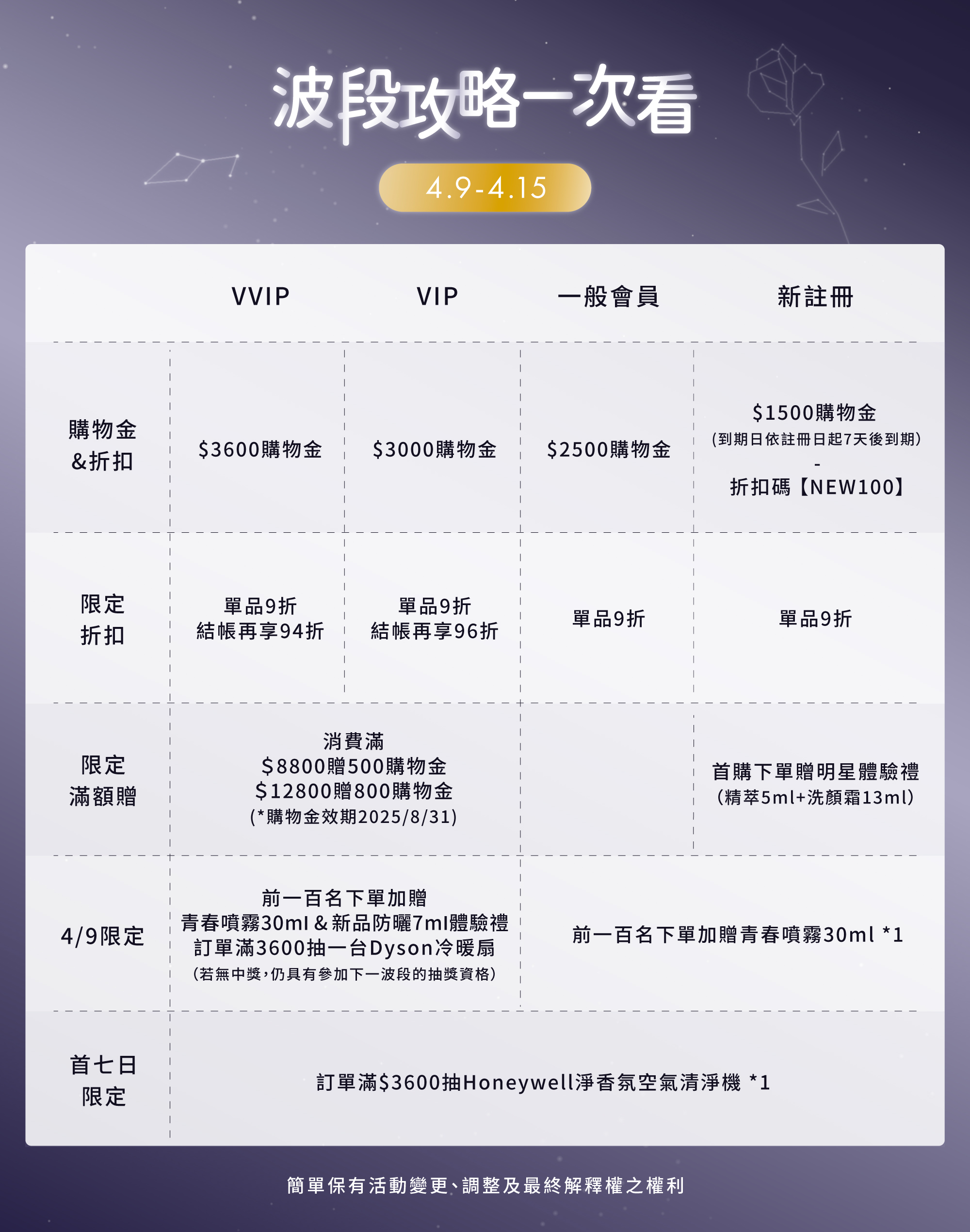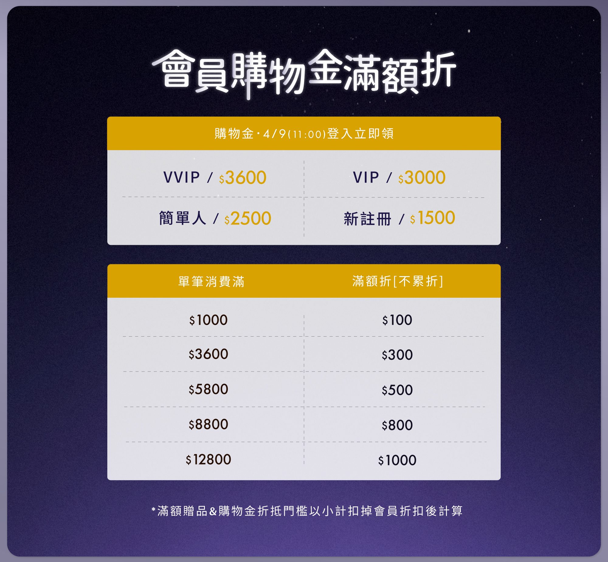 VIP會員在早鳥首7日4/9-4/15,可獲得的3600購物金,會在4/9 上午11:00發放,並且在4/15 晚上23:59過期。