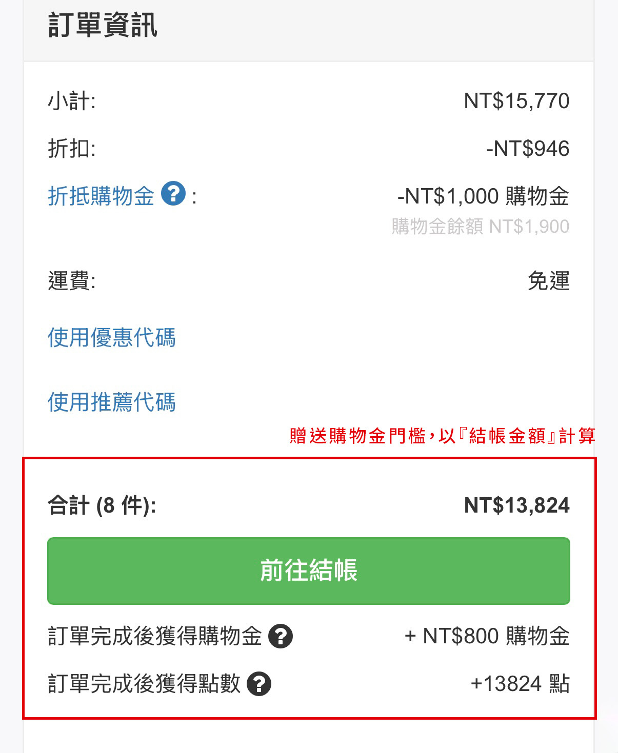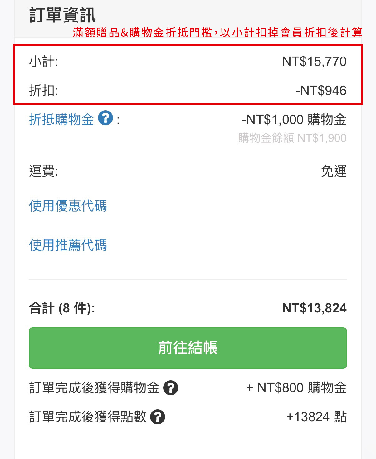 🔍情境舉例:滿額贈品&購物金折抵門檻以小計扣掉會員折扣後計算,且以累積金額達滿額門檻做相對應贈品贈送。