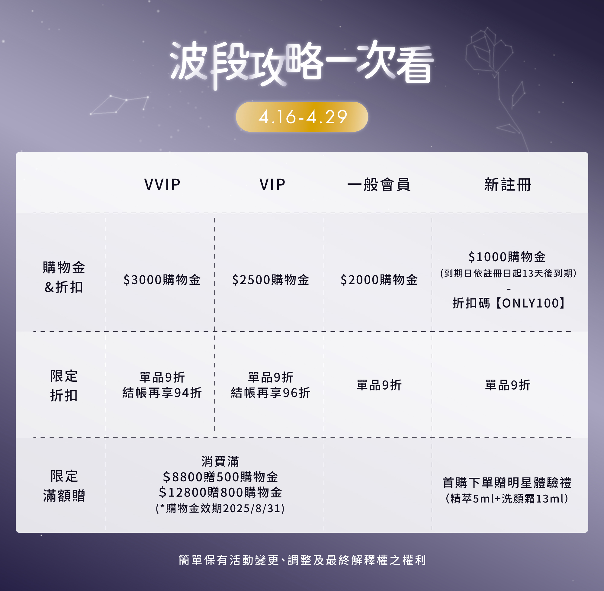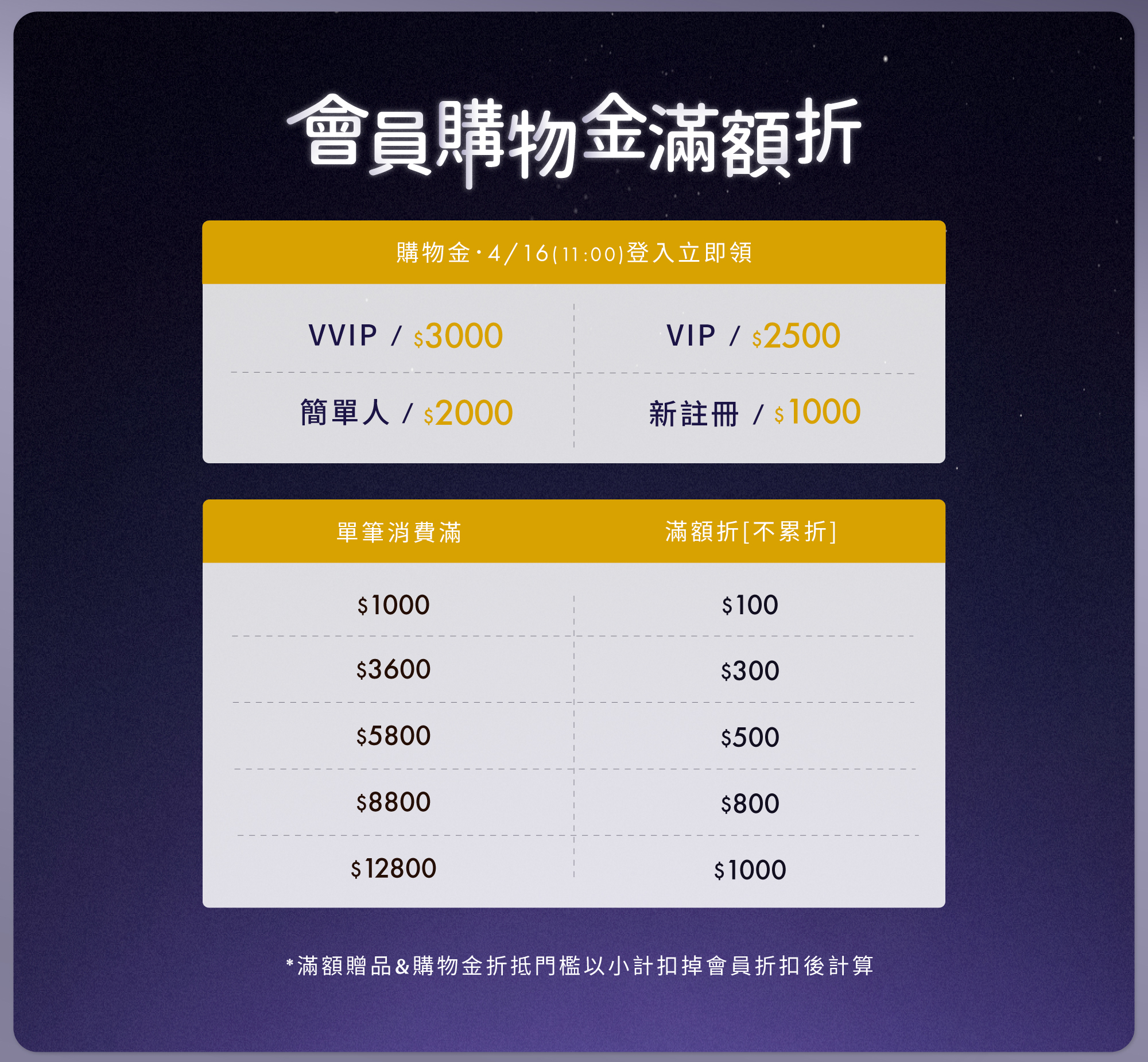 在正式開跑期間4/16-4/29,VVIP會員可獲得的3000購物金,會在4/16 中午11:00發放,並且在4/29 23:59過期。