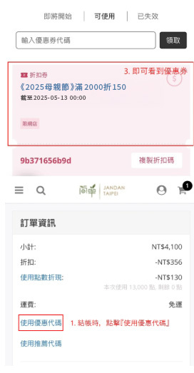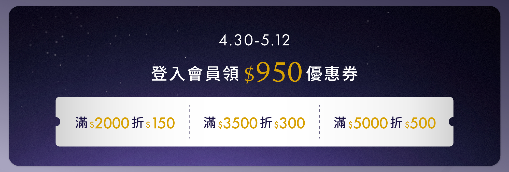 倒數波段首日4/30 中午11:00,登入會員即可在『會員專區->優惠券』區域 (如下圖),看見『滿2000折150』『滿3500折300』『滿5000折500』優惠券。此優惠券能在晚鳥倒數波段使用,5/12 23:59 便會失效。