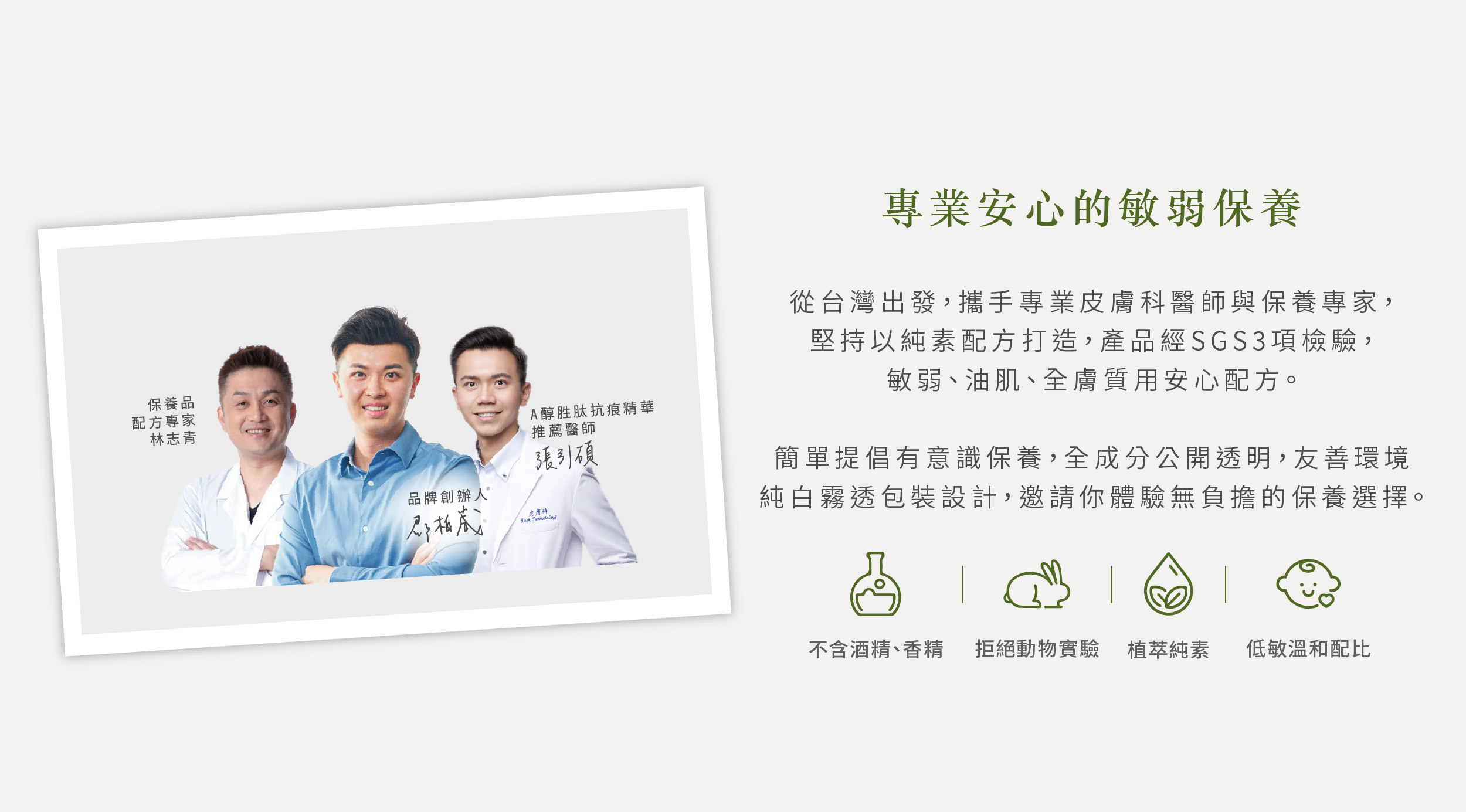 遵循Clean Beauty純淨保養用料原則,挑選歐盟認證原料,符合MSDS材料安全性數據資料規範,無酒精及動物性成分,減少對人體、環境危害,選料準則純粹透明,官網上即可檢閱完整成分標示;包裝多採用無染霧透玻璃、白色紙盒,逐步減緩製程碳足跡已降低環境傷害。