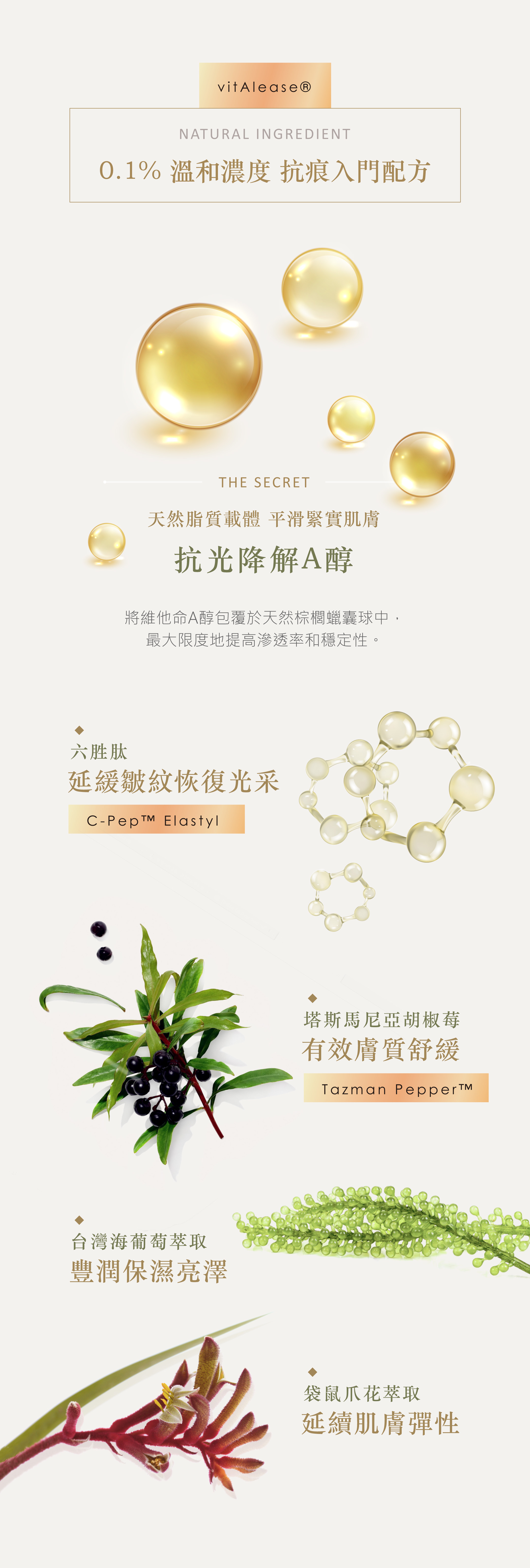 ◆ A醇胜肽抗痕精華:0.1% A醇濃度,溫和配方可每日使用,敏弱肌也適合
