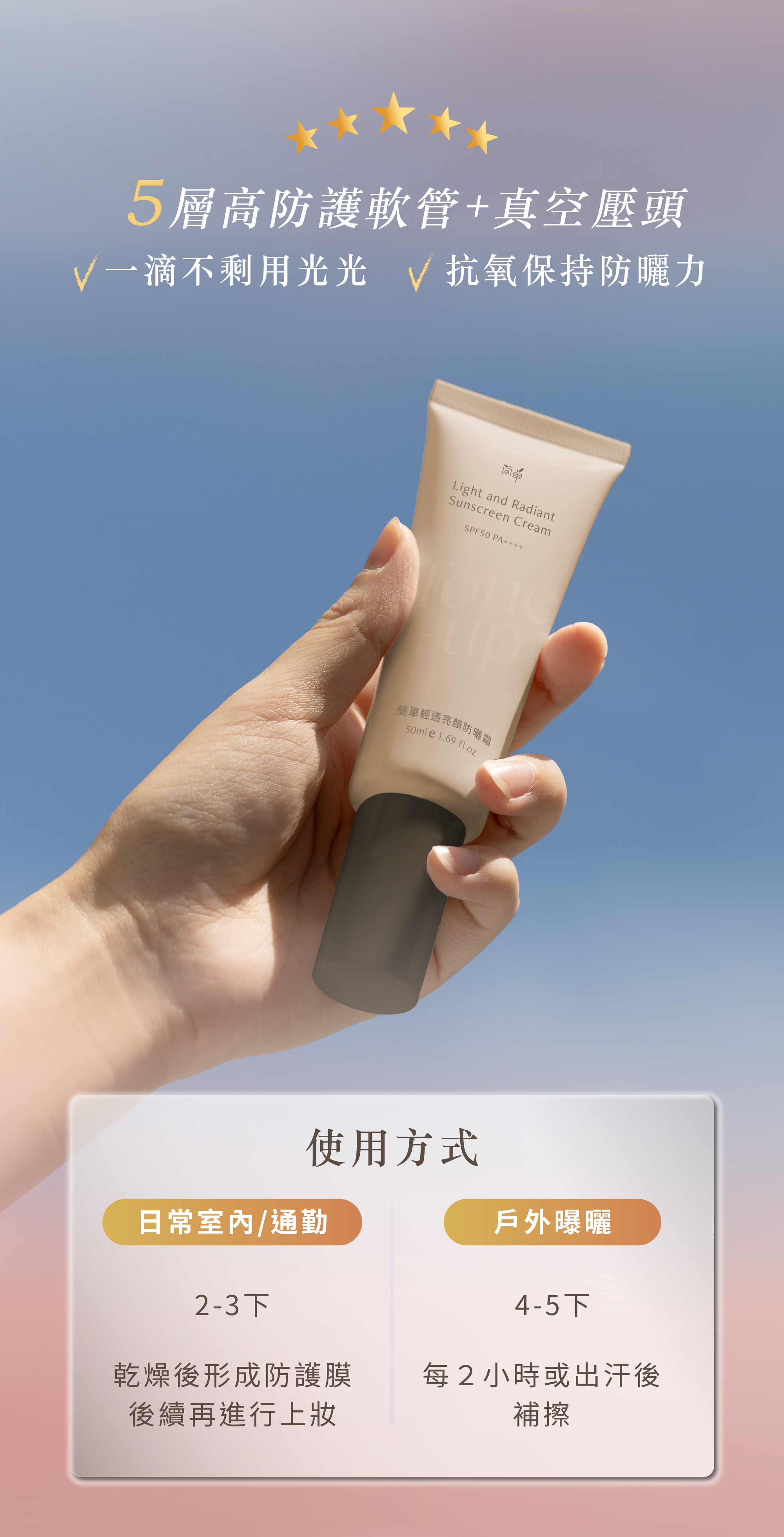 A 請按壓完整的5下,沒錯!就是要這個量才能有效達到防護效果,可以分批次上臉等待吸收後再進行後續化妝步驟。
