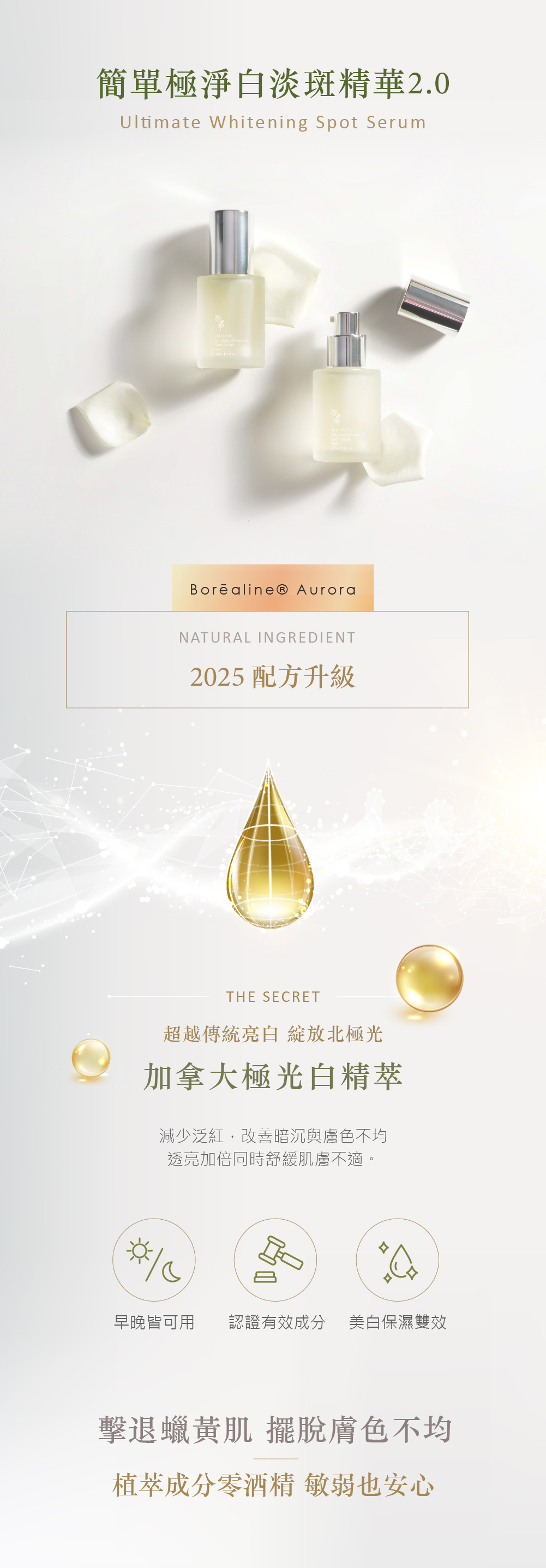 ◆ 極淨白淡斑精華2.0:配方新升級,添加極光松樹透亮更發光